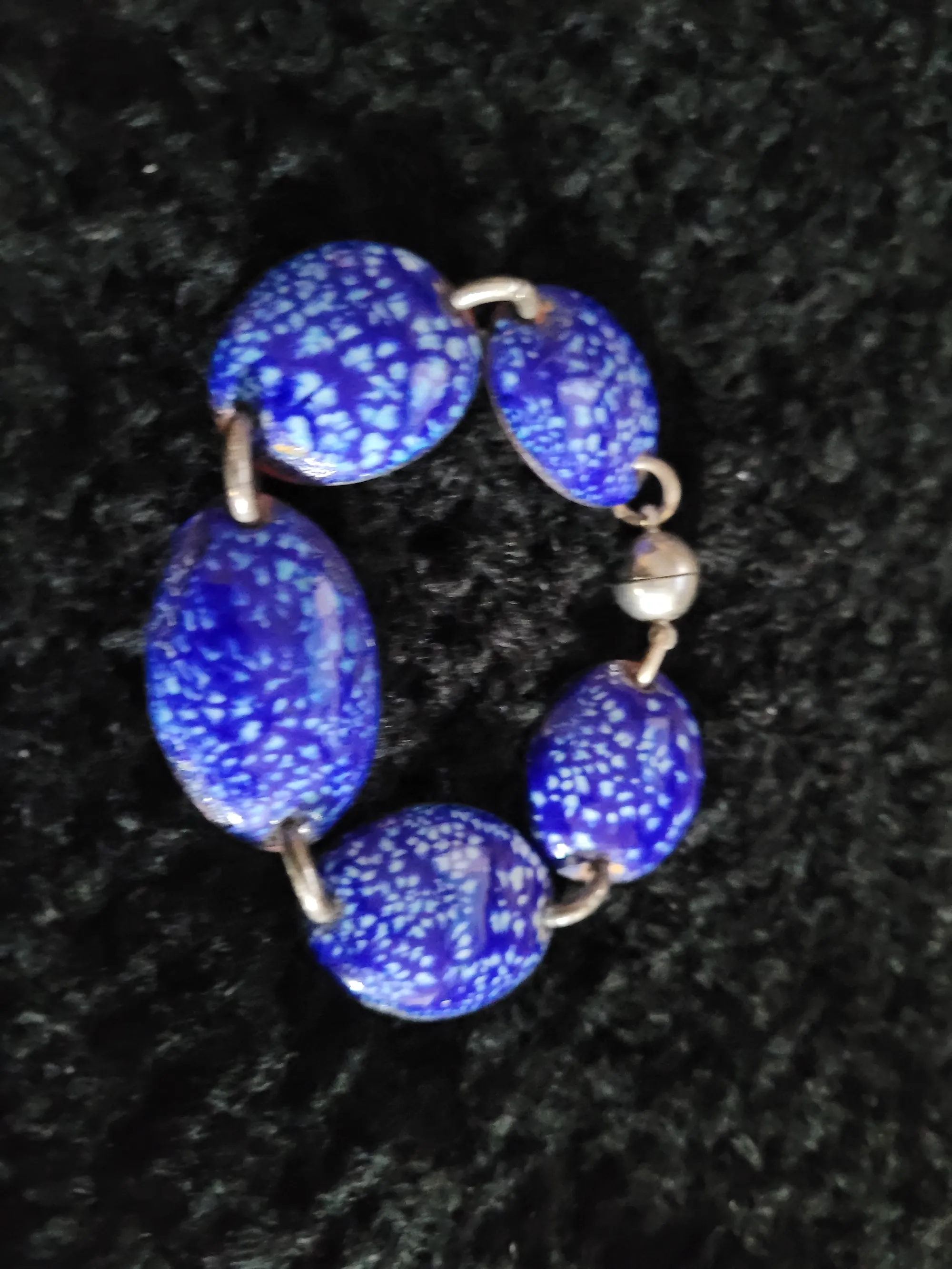 Specked blue 2 cent coin bracelet with sterling silver jump rings.