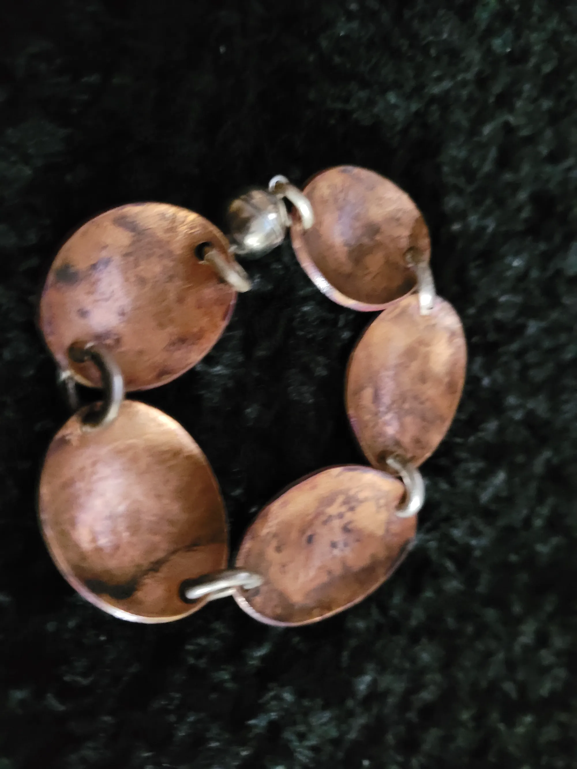Specked blue 2 cent coin bracelet with sterling silver jump rings.